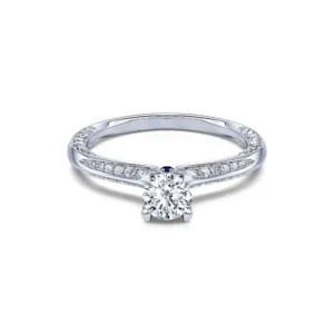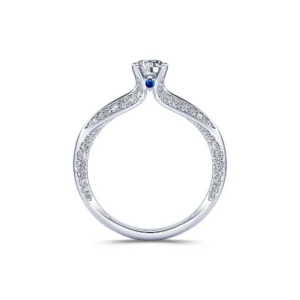 Con varias facetas de su engaste engastadas con diamantes y gracias a sus líneas aparentemente infinitas, este brillante anillo de compromiso realza un diamante central de 0,30 ct a 0,50 ct según la versión elegida, para un peso total del diamante de entre 0,62 ct y 0,80 ct. El diamante redondo brillante de calidad G/SI1 está engastado con 4 garras y realzado por 2 zafiros que lo adornan a ambos lados del bisel.