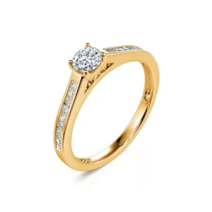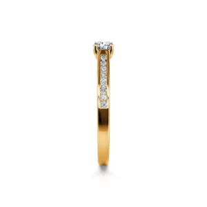 Tradicional y atemporal, Dolores es una creación en oro amarillo 750/1000 que evoca la inmortalidad de tu amor. Gracias a su piedra central, un diamante color G con pureza SI1, que varía de 0,22 ct a 0,40 ct, este anillo de compromiso acompañado puede corresponder tanto a los deseos más discretos como a los más imponentes.