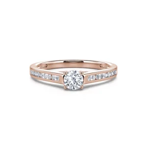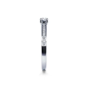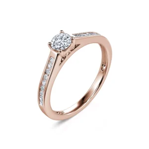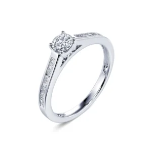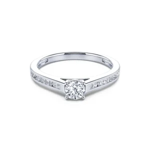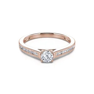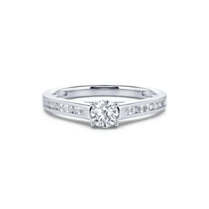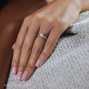 Engastado con 4 garras en un collar que sobresale ligeramente del cuerpo del anillo, el diamante redondo central está disponible desde 0,20 ct hasta 0,40 ct para satisfacer todos los deseos. Se revela en toda su luminosidad y adorna con elegancia el resto del engaste para un anillo de compromiso decididamente atemporal.