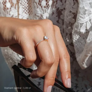 Este solitario atemporal está adornado en su centro con un diamante talla brillante que se eleva hacia la luz gracias a su engaste de 4 puntas, llamado “pico de águila”, plegado hacia abajo y refinado sobre el diamante, garantizándole un brillo incomparable y un mantenimiento sólido.
