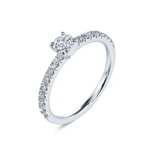 Ícono de nuestras colecciones de solitarios acompañados, Dorine es un anillo de compromiso sobrio y elegante en platino 950/1000. Su anillo engastado con finos diamantes destaca su piedra central de forma redonda, disponible desde 0,20ct hasta 1 quilate según versión y en calidad G/SI1.