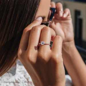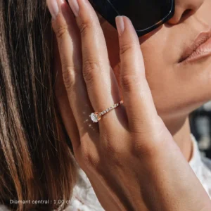 Este solitario atemporal está adornado en su centro con un diamante talla brillante que se eleva hacia la luz gracias a su engaste de 4 puntas, llamado “pico de águila”, plegado hacia abajo y refinado sobre el diamante, garantizándole un brillo incomparable y un mantenimiento sólido.