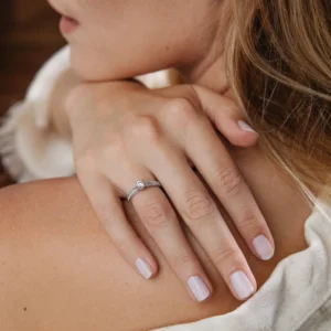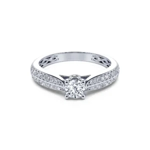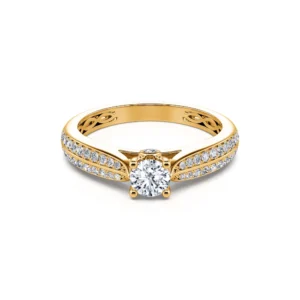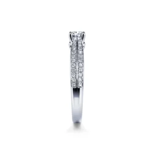 En el centro de la creación se encuentra un diamante redondo sublime de calidad G/SI1 que parece elevarse sobre un río de diamantes. Destacado por sus 4 garras, es atravesado por la luz de lado a lado para resaltar todo su brillo.