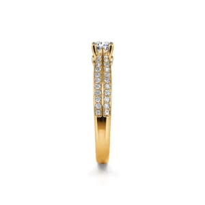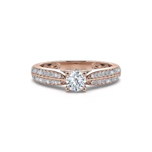 Máximo refinamiento, Faustine es una creación en oro rosa que ofrece con elegancia un resplandor incomparable. Anillo de compromiso engastado con un diamante redondo de 0,26 ct en su centro, va acompañado de un pavé de diamantes de 0,25 ct desplegados en dos hileras.