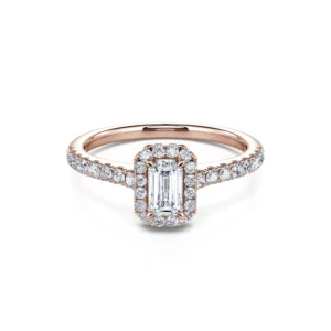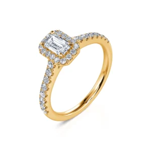 Gabriella es refinamiento en estado puro. Un fino halo de diamantes rodea un espléndido diamante de talla esmeralda de 0,50 ct, 070 o 1 ct sobre un engaste de oro amarillo de 750/1000.