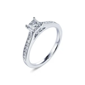 Este solitario con un diamante central talla princesa de calidad F-VS2 revela todo su brillo gracias a su engaste de 4 puntas así como a su engaste rodeado por una hilera de 18 diamantes redondos.