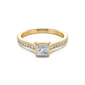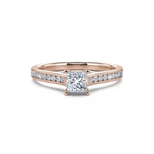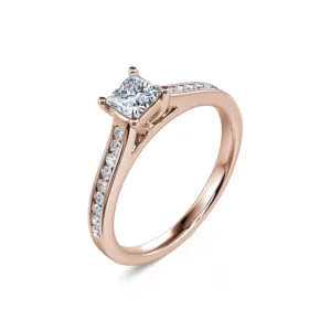 Con apariencia principesca y porte orgulloso, Laetitia es un anillo de compromiso que despierta admiración. Su diamante central de forma cuadrada, disponible en 0,30 o 0,50 ct, está engastado en un anillo de oro rosa 750/1000 acompañado de finos diamantes sujetos en un carril de material.