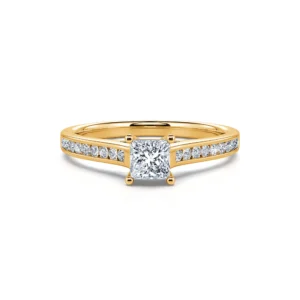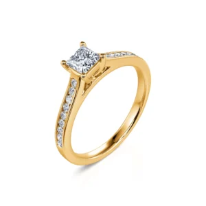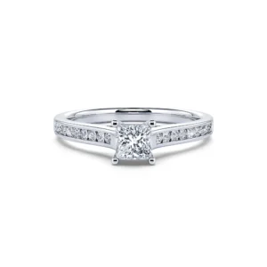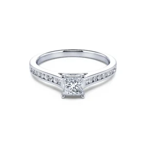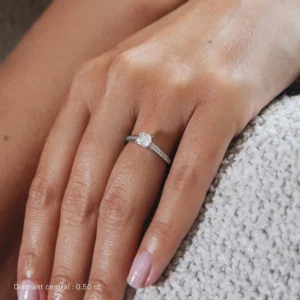 Este solitario con un diamante central talla princesa de calidad F-VS2 revela todo su brillo gracias a su engaste de 4 puntas así como a su engaste rodeado por una hilera de 18 diamantes redondos.