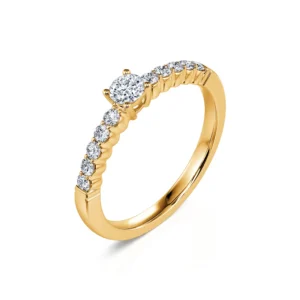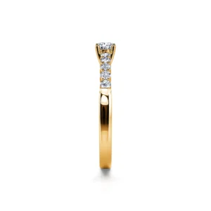 El anillo de compromiso Laurette en oro amarillo, único por su perfil dentado, es perfectamente romántico.