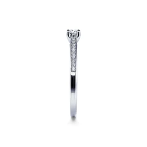 Delicado y sutil, el anillo de compromiso Lawrence en platino 950/1000 está engastado con un diamante redondo de 0,15 quilates y un engaste de diamantes de talla brillante para lograr el máximo brillo.