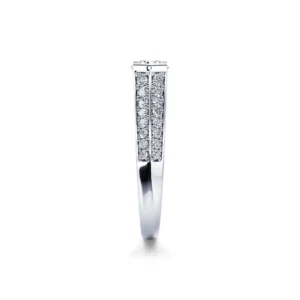 Sutilmente entreabierto, su engaste pavimentado con dos hileras de 32 diamantes redondos dibuja líneas estructuradas y gráficas. Entre materia prima y diamantes centelleantes, este engaste único gracias a su “V” deja florecer su diamante central redondo de 0,30ct y color G y pureza SI1. Gracias a su engaste de bisel abierto, este anillo de compromiso es la combinación perfecta entre una luminosidad espectacular y un soporte excepcional, entre gracia y modernidad.