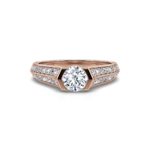 Nivia es una creación excepcional que revoluciona el estilo tradicional del anillo de compromiso. Este sublime solitario en oro rosa se compone de un engaste de pavé en dos grandes hileras perfectamente simétricas, así como de un diamante central talla brillante de 0,30 ct en engaste de bisel abierto.