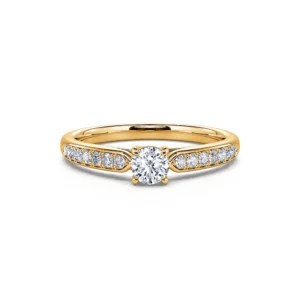 Magnífico, el diamante redondo de color G y pureza SI1 está sostenido en el centro de esta creación por 4 garras llamadas “pico de águila” para dejar que la luz llegue al centro de la piedra preciosa, asegurando al mismo tiempo un excelente soporte. Su bisel entrecruzado aporta romance y delicadeza, para una creación que simboliza el carácter único del amor que siente por ti.