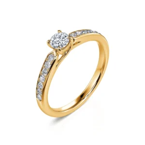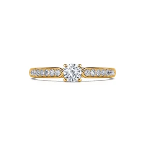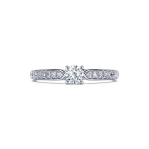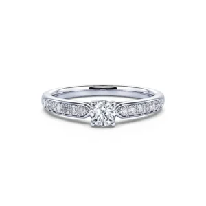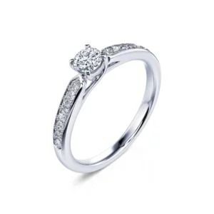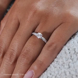 Magnífico, el diamante redondo de color G y pureza SI1 está sostenido en el centro de esta creación por 4 garras llamadas “pico de águila” para dejar que la luz llegue al centro de la piedra preciosa, asegurando al mismo tiempo un excelente soporte. Su bisel entrecruzado aporta romance y delicadeza, para una creación que simboliza el carácter único del amor que siente por ti.