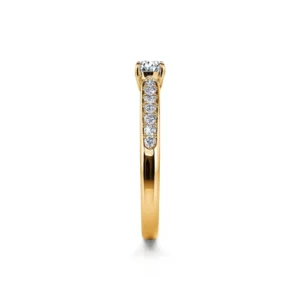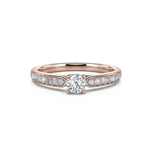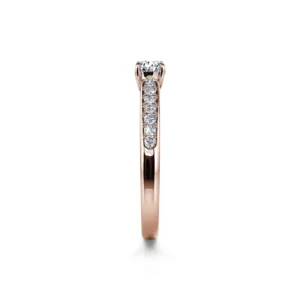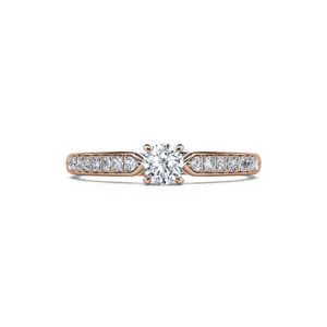 Exaltado por el brillo de las piedras que lo engarzan, Ofé es un sublime anillo de compromiso acompañado de oro rosa y un diamante central de 0,2