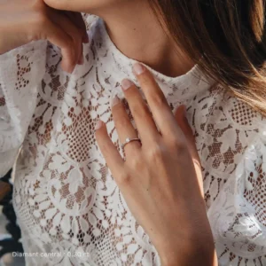 Imbuido de refinamiento y elegancia, este sublime solitario está adornado con una piedra central de calidad G-SI1 sostenida en un engaste de 4 puntas para resaltar su brillo. De estética bastante clásica, esta creación extrae su carácter único de su engaste ligeramente torcido, que revela diamantes deslumbrantes aquí y allá, brindando así una luminosidad moderada para un conjunto de lo más equilibrado.