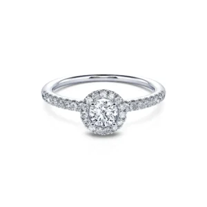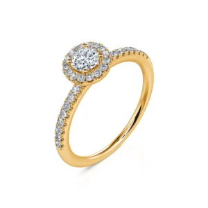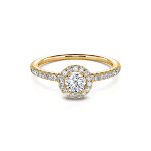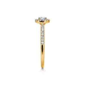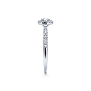 De excepcional calidad G-SI1, el diamante central de este halo solitario se sujeta entre 4 garras para preservar su forma delicada y atemporal; corte brillante. Combinada a la perfección con un borde de finos diamantes para dar la ilusión de una piedra de mayor peso, la piedra central también está acompañada de diamantes luminosos en la mitad de su engaste redondeado para lograr un brillo infinito.