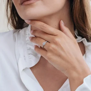 Un icono del amor, el anillo de compromiso Tracie en platino 950/1000 ofrece un halo de luz alrededor de su elegante piedra central redonda de 0,20 ct.